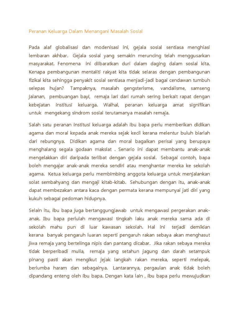 Mereka seharusnya mengambil alih tugas ibu bapa ketika ibu bapa sibuk menguruskan pekerjaan. Peranan Keluarga Menangani Masalah Sosial Dalam Kalangan Remaja Dasawarsa ini sering meniti dari bibir ke bibir masyarakat Malaysia isu kebejatan moral dan keruntuhan akhlak para remaja harapan bangsa yang semakin meruncing. Remaja yang setahun jagung dan darah setampuk pinang pasti akan mengikut jejak langkah rakan mereka seperti melepak berlumba haram dan sebagainya.